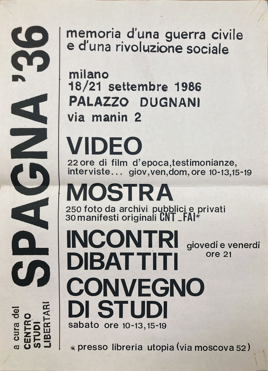 Locandina del seminario "Spagna ‘36: memoria di una guerra civile e di una rivoluzione sociale" (Palazzo Dugnani, Milano, 18-20 settembre 1986) e delle varie iniziative collegate (mostre, proiezioni, dibattiti).
